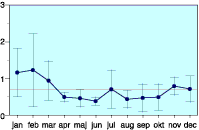 Flödets säsongsvariation 2001-2005. Månadsmedelvärden ± SD. Röd linje visar medelvärdet för hela perioden. |