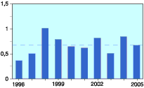 Flödets mellanårsvariation 1996-2005. Streckad linje visar medelvärdet för hela perioden. |