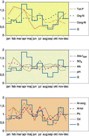 | Säsongsvariation för vattenföring och valda variabler under perioden 1995-2000. Månadsvärdena är normaliserade mot medelvärdet för hela perioden. | ||||