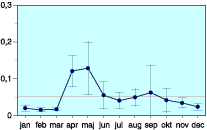 Flödets säsongsvariation 2001-2005. Månadsmedelvärden ± SD.