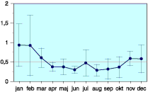 Flödets säsongsvariation 2001-2005. Månadsmedelvärden ± SD. Röd linje visar medelvärdet för hela perioden. |
