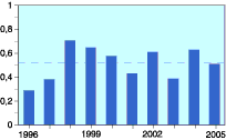 Flödets mellanårsvariation 1996-2005. Streckad linje visar medelvärdet för hela perioden. |