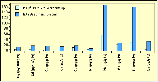 Halter av metaller i sjösediment år 1999. Halter i nutida sediment (0-2 cm) på vattendjup > 5 m (n =17) jämförs med halter i sediment från preindustriell tid.