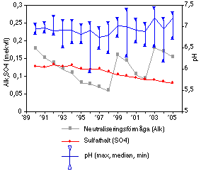 Kommentar:Västra Skälsjön har bara kalkats två gånger under mätperioden och kalkades dessförinnan 1986. Sulfathalten i Västra Skälsjön ligger i nivån 0,100,15 mekv/l och har sjunkit ca 1/3 under perioden. Alkaliniteten har sjunkit mycket långsamt, (0,013 mekv/l,år) vilket är att vänta med 6 års vattenomsättningstid. pH har legat relativt stabilt omkring 7,0 under nästan hela mätperioden trots den konstant sjunkande neutraliseringsförmågan. pH har dock fallit till 5,9 under ett år (1996). |