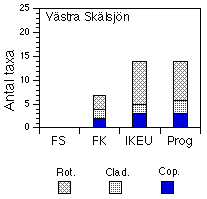 Antal påträffade arter i håvprov före försurning (FS), åren före kalkning (FK) - ofta i surt tillstånd - samt inom IKEU år 1991-92 och enligt en generell prognos för skogssjöar i södra och mellersta Sverige (Prog). Arter inom grupperna hjuldjur (Rot.), hinnkräftor (Clad.) och hoppkräftor (Cop.) anges separat.